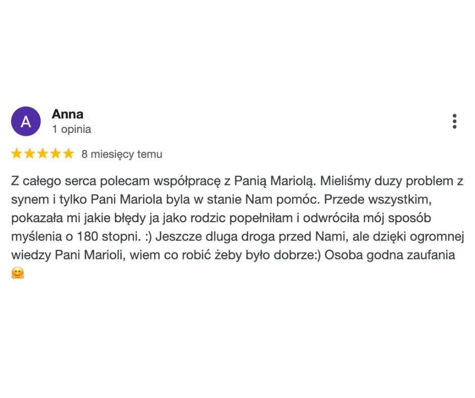 Z całego serca polecam współpracę z Panią Mariolą. Mieliśmy duzy problem z synem i tylko Pani Mariola byla w stanie Nam pomóc. Przede wszystkim, pokazała mi jakie błędy ja jako rodzic popełniłam i odwróciła mój sposób myślenia o 180 stopni. :) Jeszcze dluga droga przed Nami, ale dzięki ogromnej wiedzy Pani Marioli, wiem (...)